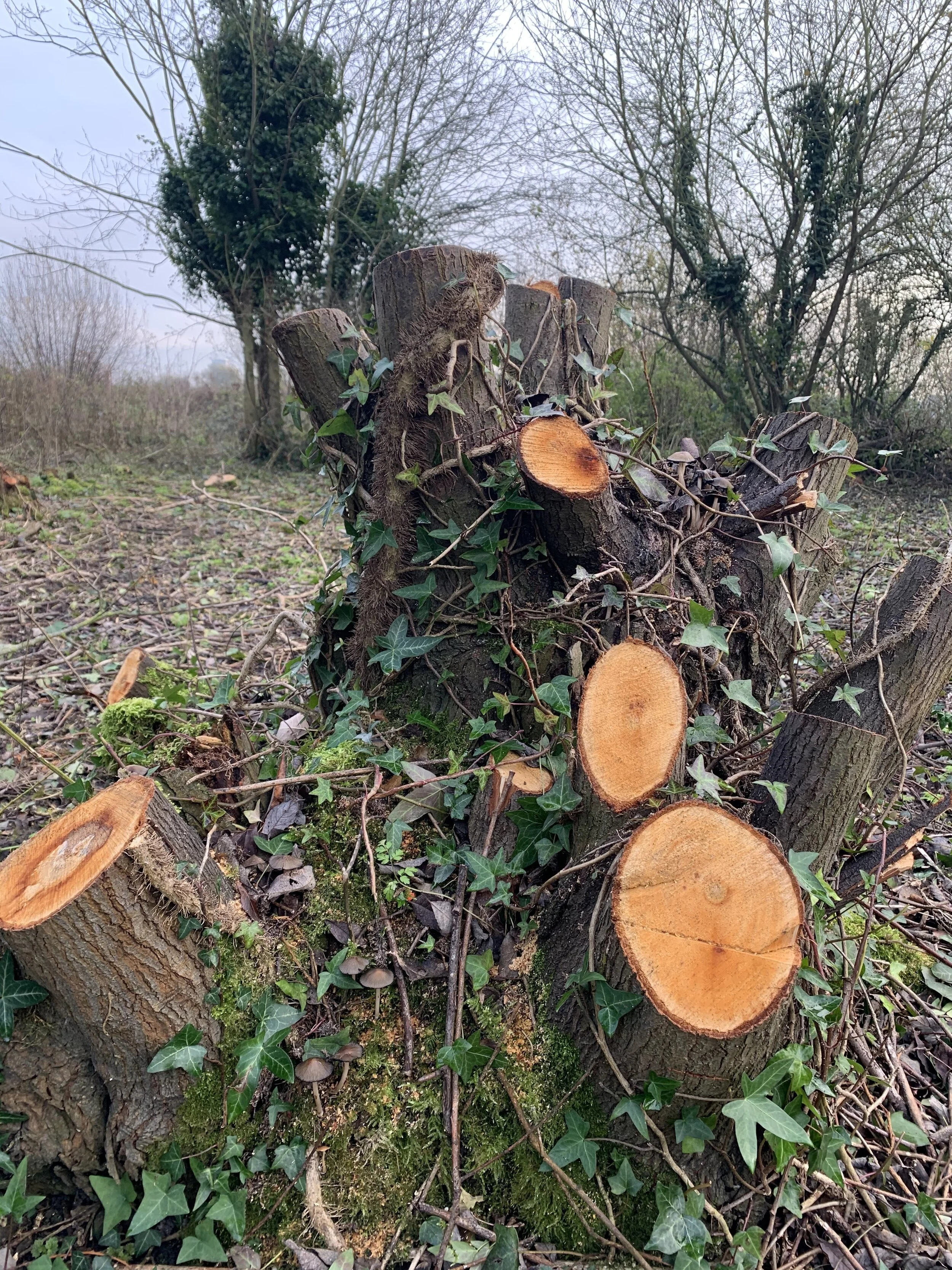 Willows are the predominant tree in the part of the Marshes called Horseshoe Thicket. There is a coppiced area of trees there. Coppicing is a traditional way of seasonally cutting back certain trees to sustainably harvest wood. Coppicing improves biodiversity by allowing more sunlight to reach the ground, which allows for more wildflowers (also meaning more food for insects and pollinators). The tree stumps that are left, called stools, have crevices that can house small mammals like dormice, and mushrooms often grow on the dead bark. The tree itself may even be able to live longer, if it is allowed to grow before being coppiced again. Although it may seem counter-intuitive, sometimes a seemingly destructive act can be good for new growth and to encourage diversity. By dismantling, or deconstructing, existing social constructs that are out of date or that restrict us from further growth, like patriarchy or gender constructs, we can open up a space for something new.